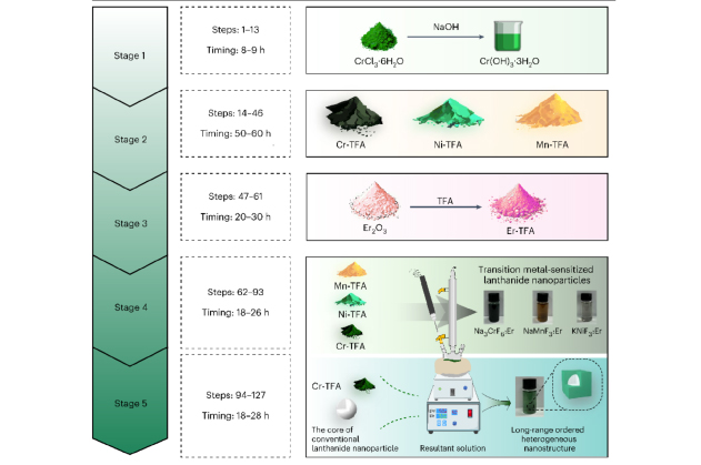針對(duì)這一難題,本研究團(tuán)隊(duì)統(tǒng)介紹了過(guò)渡金屬敏化鑭系近紅外發(fā)光納米粒子的合成方法,為高性能發(fā)光材料的開(kāi)發(fā)提供了標(biāo)準(zhǔn)化方案。該協(xié)議詳細(xì)闡述了從三氟乙酸鹽前驅(qū)體制備到最終納米粒子合成的全流程,涵蓋鉻、錳、鎳三種過(guò)渡金屬離子作為敏化劑的合成路徑。與傳統(tǒng)鑭系材料相比,過(guò)渡金屬離子具有更高的摩爾吸光系數(shù),能夠顯著提升材料的吸光能力和發(fā)光效率。