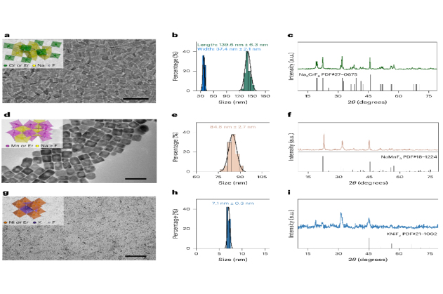 圖2. (a-c)鉻敏化鑭系納米顆粒(Na3CrF6:Er)的結(jié)構(gòu)與形貌表征。