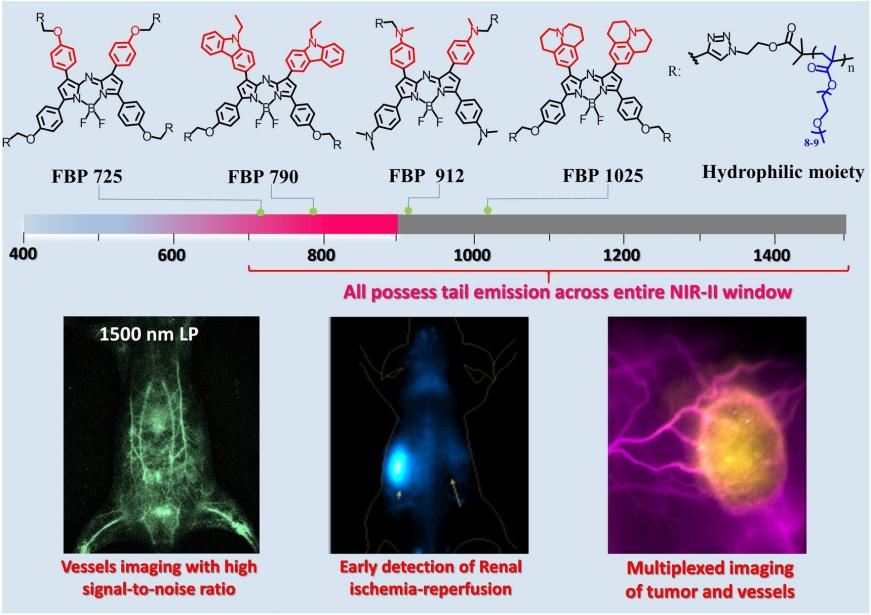 針對以上問題,研究團(tuán)隊構(gòu)筑了一系列基于氮雜-氟硼熒(aza-BODIPY)的腎臟可清除的刷狀大分子熒光探針(命名為FBP),其發(fā)射波長從725 nm到1025 nm之間可調(diào)節(jié)。優(yōu)化篩選出的FBP 912探針,其亮度(波長> 1000 nm)是目前所報道的腎臟可清除的近紅外二區(qū)有機(jī)探針的10倍左右,并且該探針在12 h內(nèi)約65%能從腎臟中代謝,能夠?qū)崿F(xiàn)對腎臟缺血再灌注損傷的早期高靈敏度檢測。FBP 912探針的血液循環(huán)時間達(dá)到6.1 h,在4T1腫瘤的被動靶向成像以及腎細(xì)胞癌主動靶向成像方面表現(xiàn)出優(yōu)異的信噪比和較長的腫瘤保留時間。