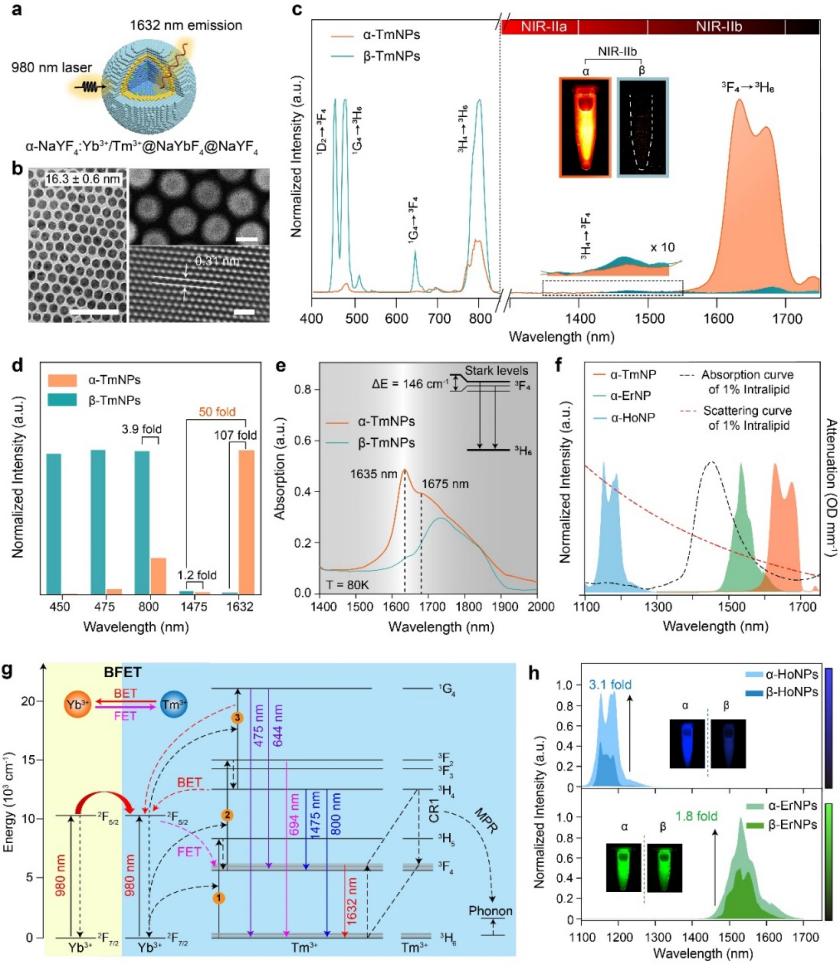 針對以上難題,研究團隊開發(fā)了一系列立方晶相的稀土堿金屬氟化物納米熒光探針,并搭建了雙通道熒光成像裝置,在1500-1700 nm波段實現(xiàn)了活體實時動態(tài)的多重成像。傳統(tǒng)的研究中,由于六方晶相的稀土堿金屬氟化物(β-NaREF4)具有較小的聲子能,從而導致的更低的非輻射弛豫概率,通常被認為更加有利于提高發(fā)光效率,因此作為一種經(jīng)典的稀土探針基質而廣泛使用。而團隊成員發(fā)現(xiàn),相較于β-NaREF4基質,在立方晶相的堿金屬氟化物(α-NaREF4)基質中,Tm3+摻雜的稀土熒光探針在1632 nm處中有近百倍的下轉移發(fā)光增強。通過拉曼光譜、變溫熒光及光子數(shù)測試證明α-NaREF4基質較高的聲子能有效地促進了Tm3+的電子從3H4能級通過非輻射躍遷的方式到達3F4能級,從而增強了3F4能級的電子布居,且立方相基質中激活劑離子間的交叉弛豫以及激活劑離子與敏化劑離子之間的能量傳遞過程也進一步導致了Tm3+在1632 nm處的下轉移發(fā)光增強?;诖藷晒庠鰪姍C理,也實現(xiàn)了Er3+和Ho3+摻雜的近紅外稀土熒光探針在1530 nm和1180 nm處不同程度的下轉移發(fā)光增強。該Tm3+元素摻雜的新型近紅外稀土熒光探針為近紅外二區(qū)多重熒光成像提供了新的波長選擇。