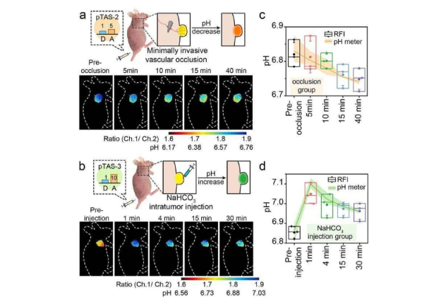 圖 3. 比率熒光探針pTAS-2與pTAS-3在腫瘤部位pH下降(a,c)和上升(b,d)過程中對腫瘤部位pH的實時定量檢測。