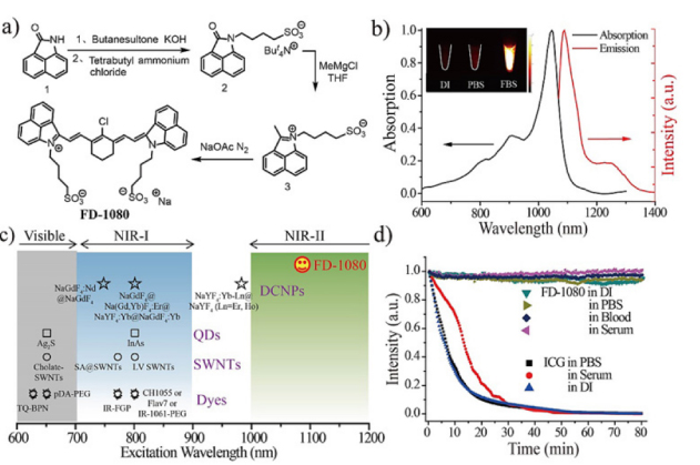 (b) FD-1080的吸收及熒光光譜圖;
