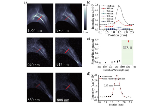 (a) 不同激發(fā)波長(zhǎng)對(duì)小鼠左下肢成像圖;