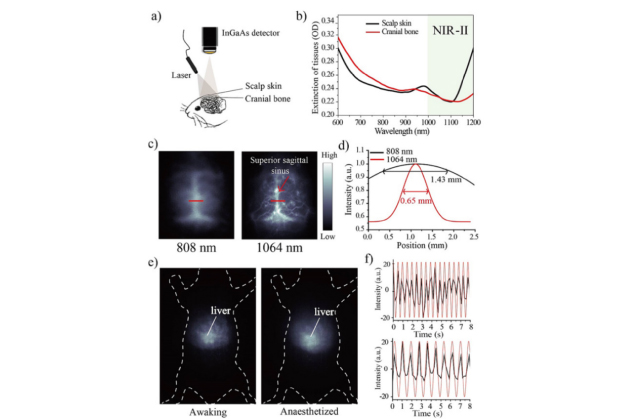 (e) 1064 nm激發(fā)下小鼠清醒及麻醉狀況下肝臟成像圖;