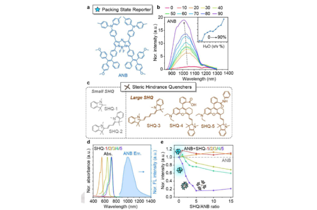 鑒于BODIPY染料優(yōu)異的光學性質(zhì),在此,作者提出構建以AIE為特征的NIR-II BODIPY染料ANB作為分子堆積狀態(tài)報告子,其中Aza-BODIPY核用作電子受體,而具有給電子和旋轉(zhuǎn)性質(zhì)的TPA和TPE單元則被作為電子供體。ANB在600 nm至850 nm范圍內(nèi)均具有吸光度,峰值為685/775 nm,摩爾消光系數(shù)為2.44-3.73×104 M−1 cm−1。被兩親性mDSPE-PEG2000包封后,ANB在PBS中的量子產(chǎn)率可達0.13%。不僅如此,作者制備了一系列具有不同立體化學結構的空間位阻猝滅劑(SHQ-1~5)(圖1),并與ANB共包封以促使NIR-II信號持續(xù)猝滅并達到“關”狀態(tài)。