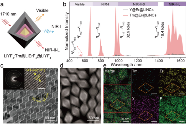 圖1. (a) 本工作開發(fā)的一種可被1710 nm激發(fā)產(chǎn)生反斯托克斯位移發(fā)光的新型稀土納米晶;