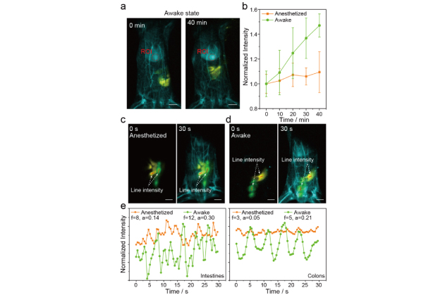 (c-e) 使用三種NIR-IIb的納米探針對小鼠不同生理狀態(tài)下的多重動態(tài)成像結(jié)果,提取出的熒光強(qiáng)度隨時間變化反映了大腸和結(jié)直腸在清醒和麻醉狀態(tài)下的蠕動差異。