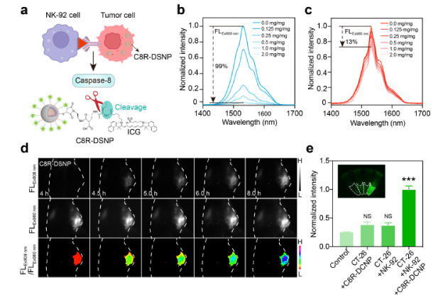 免疫細(xì)胞治療是一種革命性的癌癥治療方法,利用免疫細(xì)胞的力量選擇性地靶向并消滅腫瘤細(xì)胞。然而,由于傳統(tǒng)影像學(xué)方法需要每2-3周進(jìn)行一次評(píng)估,該療法的臨床應(yīng)用往往受到延遲治療評(píng)估的限制。為了解決這一關(guān)鍵挑戰(zhàn),張凡團(tuán)隊(duì)最新的研究開發(fā)了一種非侵入性納米傳感器C8R-DSNP,旨在第二近紅外長(zhǎng)波段(NIR-II-L,1500-1900 nm)特異性實(shí)時(shí)監(jiān)測(cè)免疫細(xì)胞活動(dòng)。這一創(chuàng)新策略顯著增強(qiáng)了深層組織成像能力,并加速了對(duì)治療效果的評(píng)估(僅需4.5小時(shí))。