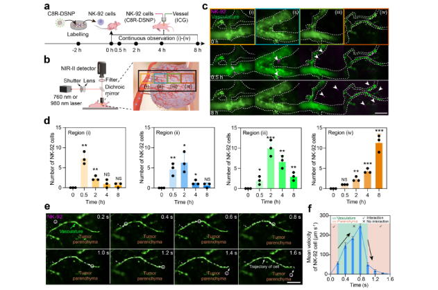 此外,免疫細(xì)胞治療過(guò)程中,了解NK細(xì)胞如何在腫瘤微環(huán)境中遷移并發(fā)揮作用,對(duì)于優(yōu)化治療策略至關(guān)重要。因此,研究團(tuán)隊(duì)利用 C8R-DSNP 標(biāo)記 NK-92 細(xì)胞,并將其回輸至腫瘤小鼠體內(nèi),連續(xù)8小時(shí)對(duì)血管內(nèi)和腫瘤組織中的NK細(xì)胞進(jìn)行單細(xì)胞追蹤。并且,高時(shí)空分辨率的NIR-II-L顯微成像揭示了NK-92細(xì)胞在從腫瘤邊緣的外圍血管逐步遷移至腫瘤實(shí)質(zhì)的過(guò)程:在腫瘤實(shí)質(zhì)中,NK-92 細(xì)胞以 51.5 μm/s ~ 0.0 μm/s低速爬行,進(jìn)入血管后速度增至 238 μm/s。這對(duì)了解NK細(xì)胞在腫瘤微環(huán)境中的動(dòng)態(tài)遷移模式提供了新的依據(jù)。