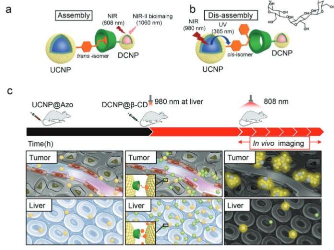 (a)納米顆粒通過偶氮苯-環(huán)糊精超分子結(jié)構(gòu)聚集示意圖,下轉(zhuǎn)換納米顆粒發(fā)射的1060 nm光可用于近紅外二區(qū)成像;