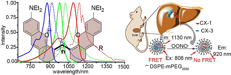 針對(duì)上述問(wèn)題,研究團(tuán)隊(duì)從穩(wěn)定性和波長(zhǎng)可調(diào)性?xún)蓚€(gè)角度出發(fā),巧妙結(jié)合了呫噸染料的結(jié)構(gòu)剛性與菁染料的波長(zhǎng)可調(diào)性,基于此開(kāi)發(fā)了系列波長(zhǎng)可調(diào)的高穩(wěn)定性近紅外二區(qū)熒光染料(CX)。與傳統(tǒng)染料相比,該類(lèi)染料在水溶液中具有更優(yōu)異的化學(xué)穩(wěn)定性和光穩(wěn)定性,其活體淋巴成像效果遠(yuǎn)勝于金標(biāo)準(zhǔn)染料吲哚菁綠。與此同時(shí),研究團(tuán)隊(duì)通過(guò)對(duì)染料光物理性質(zhì)的深入研究,成功構(gòu)筑了首個(gè)基于FRET的近紅外二區(qū)OONO-傳感探針,并將其應(yīng)用于無(wú)創(chuàng)的藥物誘導(dǎo)肝損傷檢測(cè)。相對(duì)于傳統(tǒng)的OFF-ON(無(wú)-有)型熒光探針的定性檢測(cè),基于FRET的比率型熒光探針提供的是自校正的比率信號(hào),可以實(shí)現(xiàn)定量的檢測(cè),同時(shí)結(jié)合體外模擬組織校正曲線(xiàn),為活體內(nèi)熒光定量分析提供了新的解決方案。